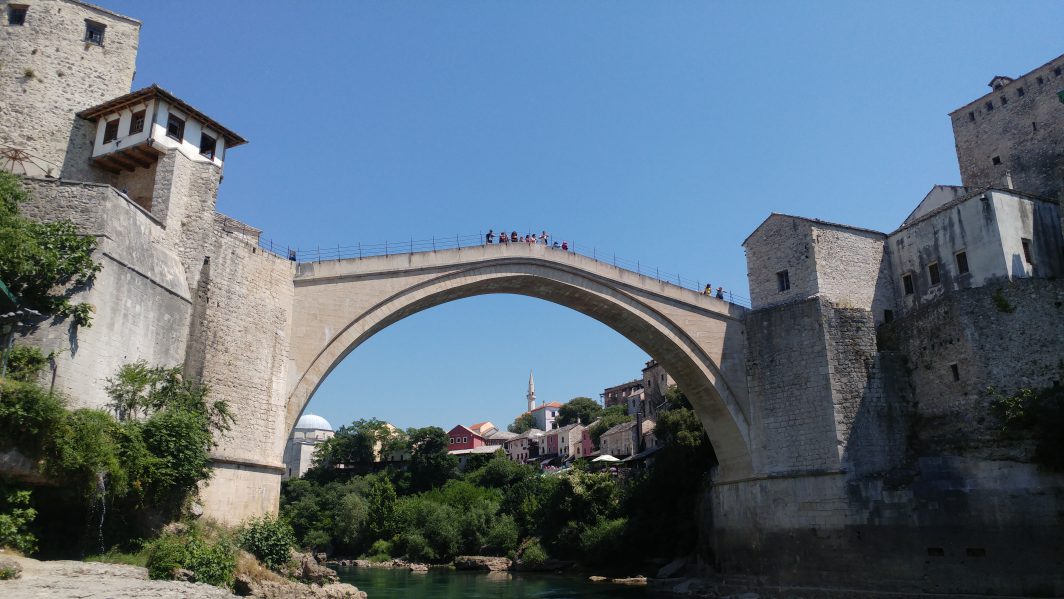 Eigentlich eignet sich Mostar perfekt für 360°: Der Fluss Neretva schlängelt sich blau-grün tief unten durch das Tal, darüber schwingt sich in elegantem Bogen die Brücke über ihn hinweg, für die Mostar berühmt ist. Sie ist DAS Motiv der vielen Touristen, die sich durch die engen Straßen der Altstadt schieben.